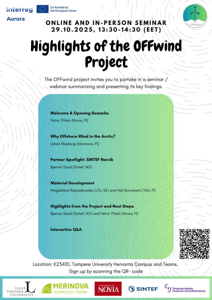 Update : on the 29.10.2025, The OFFwind project invites you to partake in a seminar/webinar summarizing and presenting its key findings. Program in picture. The program went well and dozen of participants had the joy to discover the highlights of the OFFwind project and the parts that each partners play.